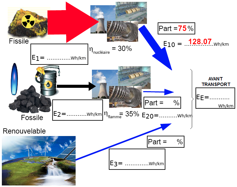 Maintenant on va calculer l'énergie primaire nécessaire à fabriquer l'électricité utilisée pour charger la voiture.