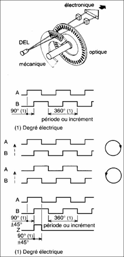Le déphasage de 90° électrique des signaux A et B permet de déterminer le sens de rotation :